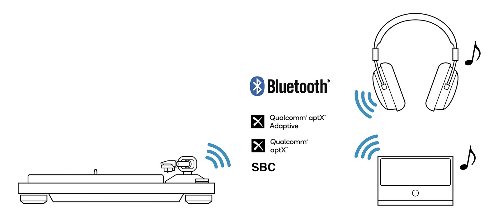 Gramofon obsługuje łączność Bluetooth, umożliwiając połączenie bezprzewodowe do słuchawek czy głośnika. Parowanie odbywa się jednym przyciskiem z diodą LED, a gramofon może zapamiętać do 8 sparowanych urządzeń. Dla słuchaczy preferujących przewodowe połączenie, TEAC dodaje wbudowany wzmacniacz phono EQ oparty na układzie NJM8080. Dzięki temu gramofon może być podłączony bezpośrednio do aktywnych głośników lub wzmacniaczy bez dedykowanego wejścia phono. Przełączalne wyjście liniowe lub phono pozostawia również możliwość późniejszej rozbudowy o zewnętrzny stopień phono.