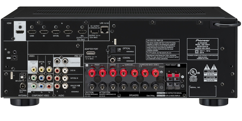 VSX-1024 został wyposażony w 6 złącz HDMI w najnowszej wersji 2.0, w tym jedno na panelu przednim kompatybilne z technologią MHL przeznaczona do urządzeń przenośnych. Złącza obsłużą także obraz 3D, technologie Deep Color (36-bit), x.v. Color oraz pass-through do rozdzielczości Ultra HD 4K. Do amplitunera możemy podpiąć do 7 głośników i 2 subwooferów, a także nagłośnić 2 strefę za pomocą dedykowanych wyjść. Moc zapewniają 140-Watowe końcówki mocy.