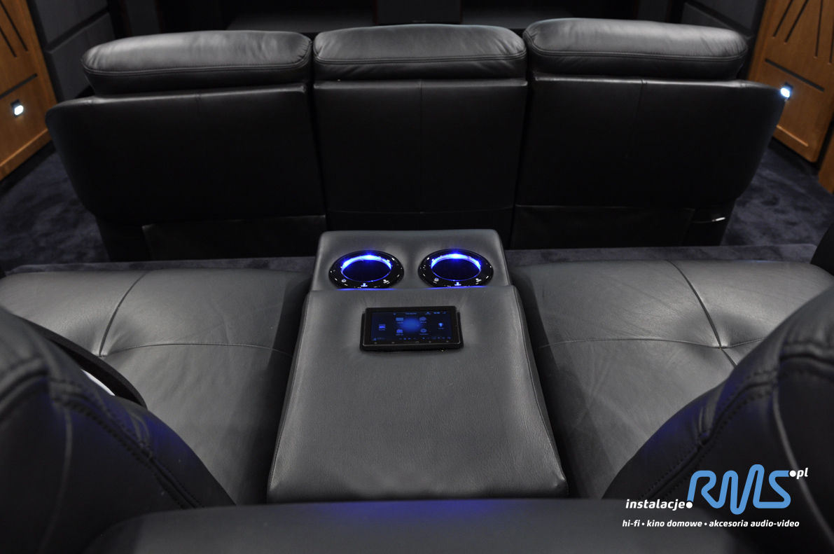 Gdy zadbaliśmy już o akustykę oraz sprzęt audio-video, przechodzimy do przydatnych dodatków. System zintegrowanego sterowania salą to nowoczesne, wygodne rozwiązanie, które kompleksowo kontroluje zarówno urządzenia audio - video, jak i rolety oraz oświetlenie. Zamiast 6 pilotów i przełączników na ścianie, mamy swój telefon lub ekran wbudowany w fotel, którym możemy sterować każdym z urządzeń osobno lub wszystkimi na raz. Jak to działa? Wystarczy, że wybierzesz swoją ulubioną stację TV, a system automatycznie uruchomi projektor, amplituner, tuner TV, przygasi światło i zasłoni roletę. A my w tym czasie, siedząc wygodnie w elektrycznie rozkładanym skórzanym fotelu, możemy popijać swój ulubiony, przyjemnie schłodzony napój.