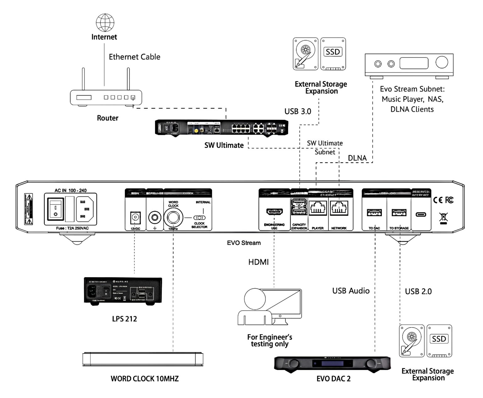 Evolution Stream wyposażono w specjalny port, który tworzy odrębną podsieć, zapewniając najwyższą wydajność podczas współpracy z odtwarzaczami, takimi jak Stream-9, oraz urządzeniami obsługującymi DLNA.