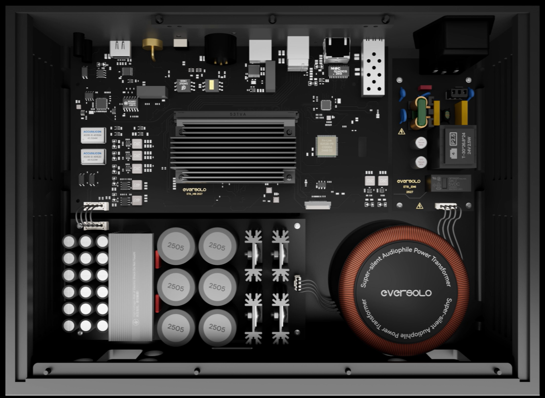 Eversolo T8 wyposażony jest w szereg najnowszych technologii, które wyróżniają go spośród zwykłych streamerów. System zegara femtosekundowego zapewnia najwyższą precyzję przetwarzania sygnału, co skutkuje szczegółowym i dynamicznym dźwiękiem bez zakłóceń jitter. Superciche zasilanie liniowe z transformatorem 4N minimalizuje szumy i zapewnia czyste tło. Dla maksymalnej różnorodności połączeń dostępne są izolowane wyjścia, w tym USB Audio, AES/EBU studyjnej jakości, osiem trybów I2S i transmisja koaksjalna do 24 bit/192 kHz. Dwa gniazda SSD do 16 TB i Gigabit LAN z modułem SFP sprawiają, że T8 jest gotowy na obsługę rozbudowanych bibliotek muzycznych i strumieni wysokiej rozdzielczości. Dzięki WiFi 6, procesorowi czterordzeniowemu, 4 GB RAM i 64 GB pamięci zapewnia wysoką prędkość i płynny multitasking. Obsługiwane są prawie wszystkie popularne formaty Hi-Res do DSD512 i PCM 768 kHz/32 bit, a korekcja Evotune dostosowuje odtwarzanie do akustyki każdego pomieszczenia.