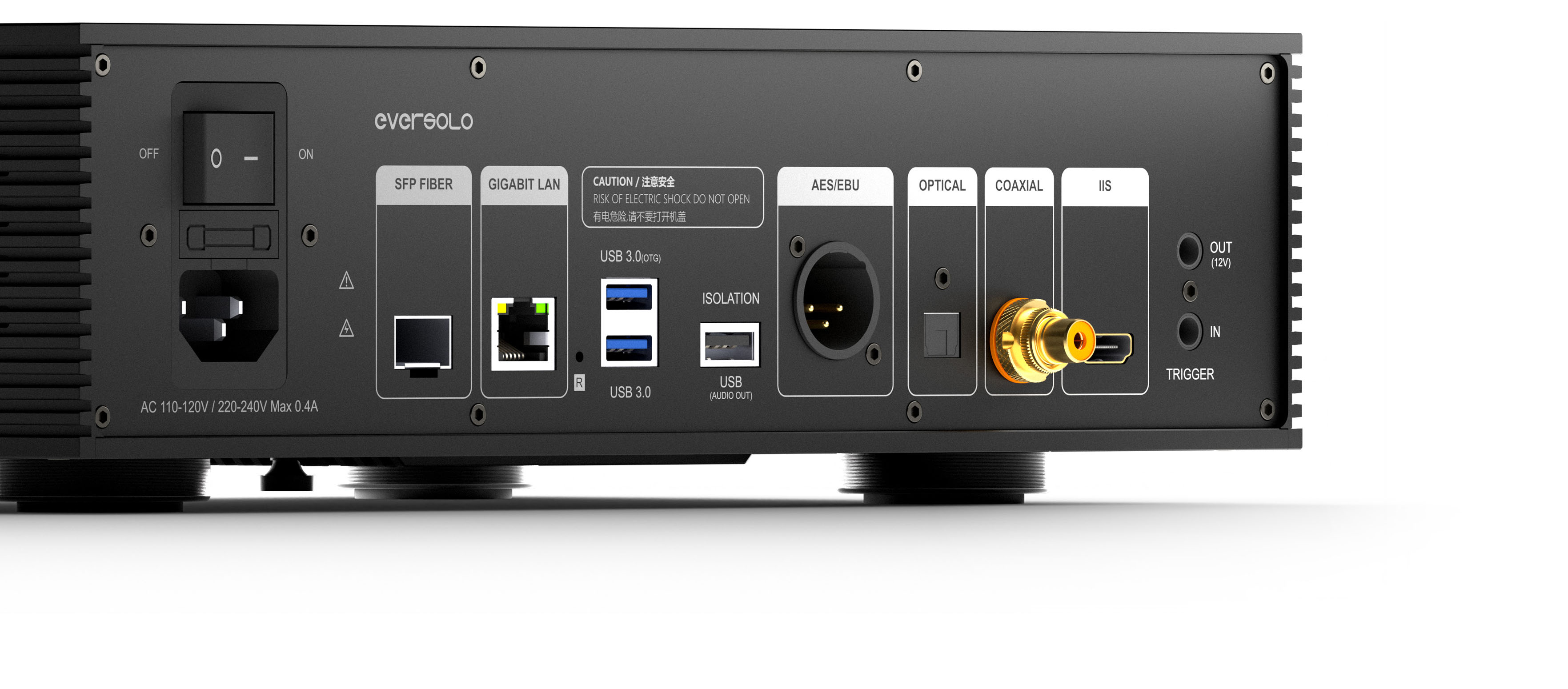 Eversolo T8 oferuje do ośmiu trybów wyjściowych I2S dla szerokiej kompatybilności DAC, izolowane wyjście USB Audio dla przesyłania sygnału bez zakłóceń oraz AES/EBU dla bezstratnej transmisji nawet na duże odległości. Dodatkowo dostępne jest wyjście koaksjalne S/PDIF, ograniczone jednak do sygnałów Linear PCM do 24 bitów i 192 kHz.